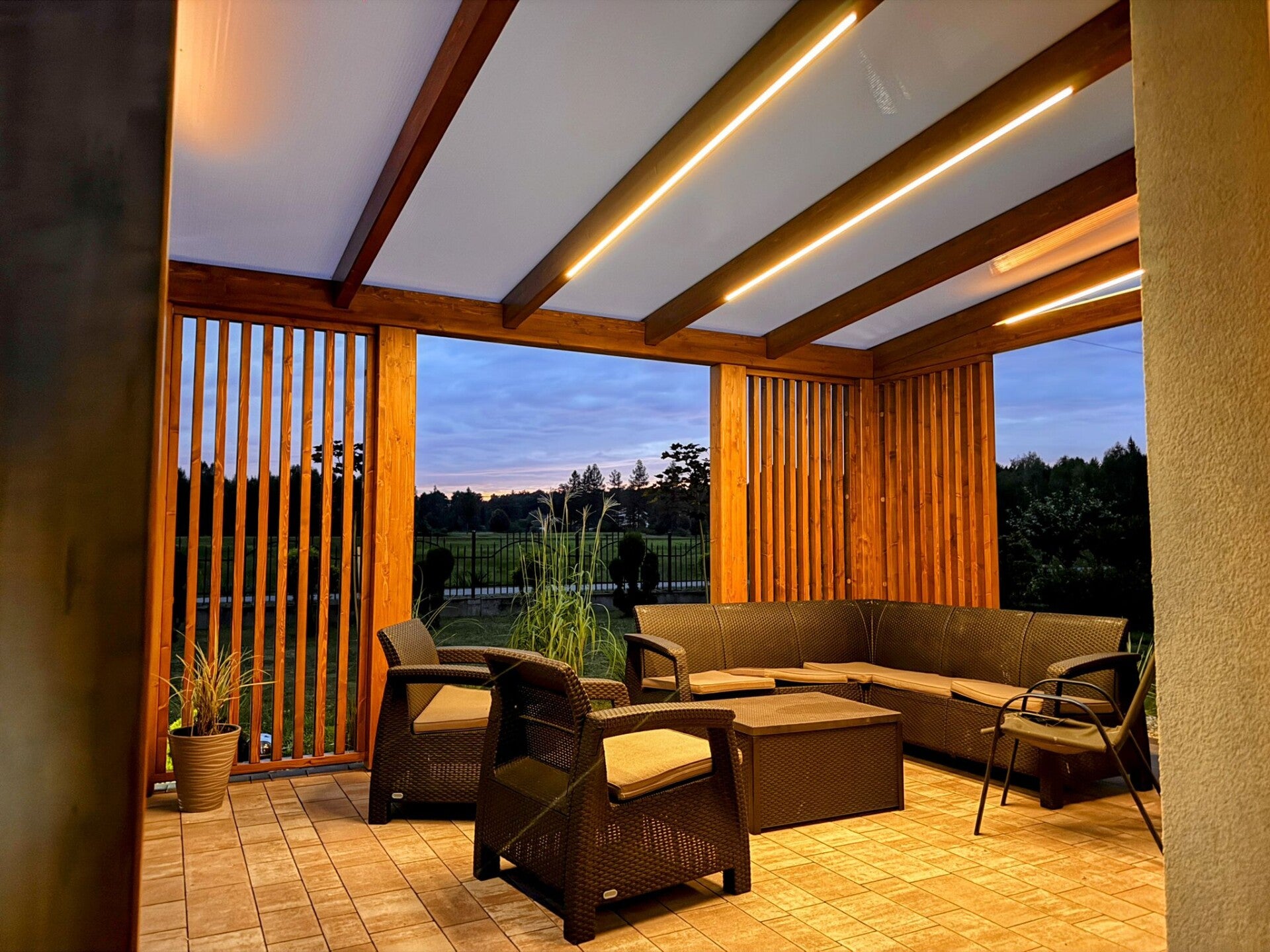 Innowacyjne pergole z ruchomymi lamelami, które pozwalają na precyzyjne sterowanie nasłonecznieniem i wentylacją, tworząc idealne warunki na tarasie.